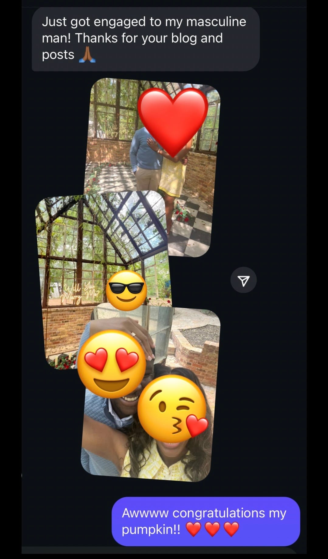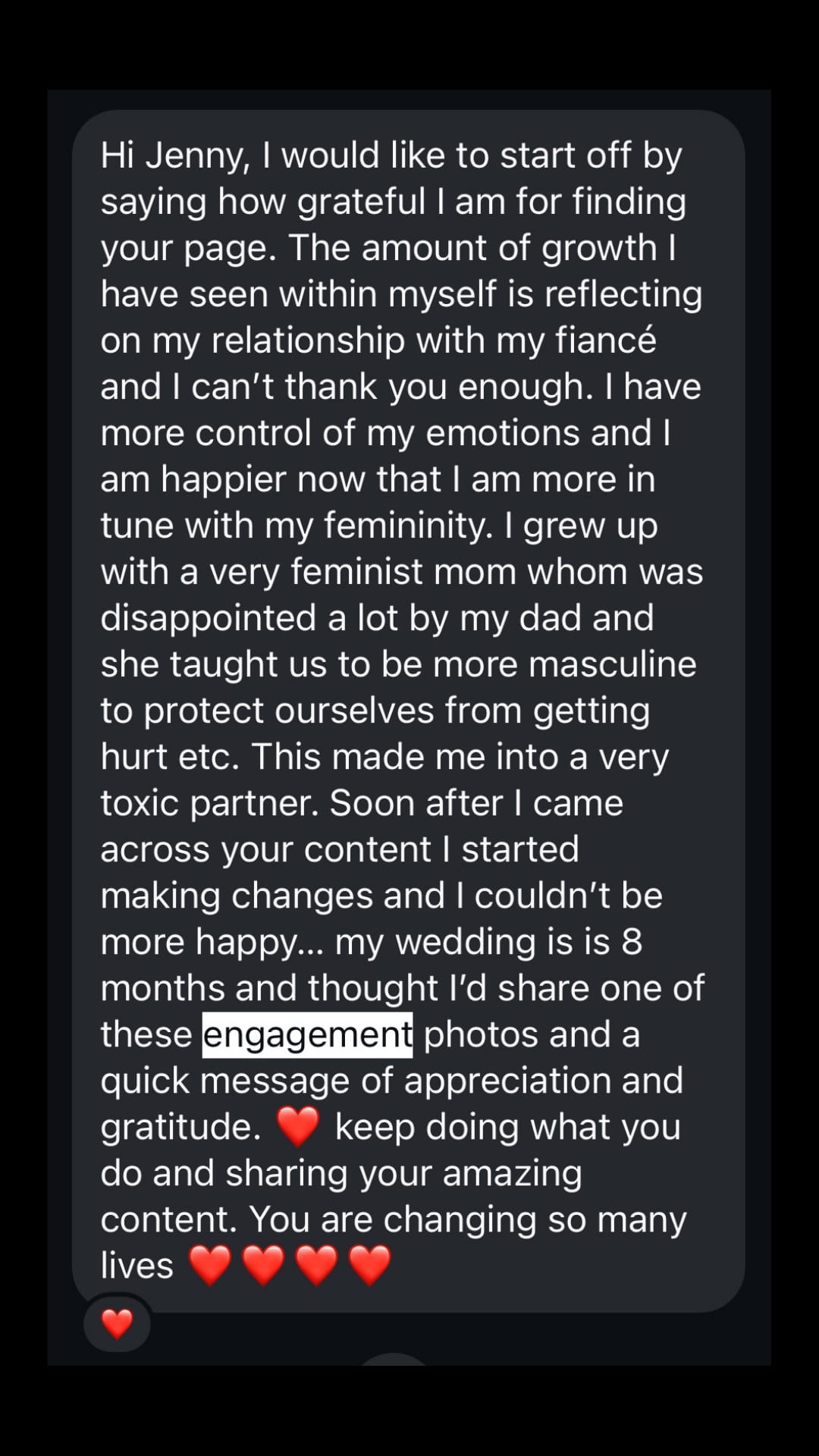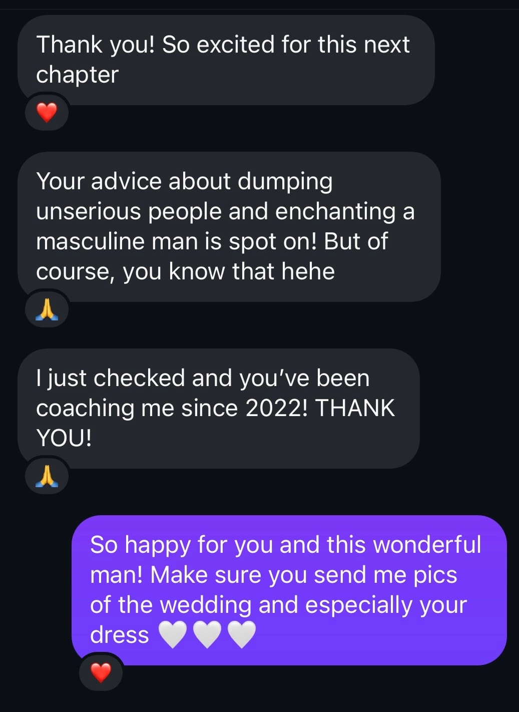 Below is proof of my solid track record in helping women get real results with men. I get women married, period. I have sooo many more women who have written me and announced they were engaged and soon-to-be married and it's been impossible for me to keep track of everyone who has found success over the last five years I've been a relationship coach.
